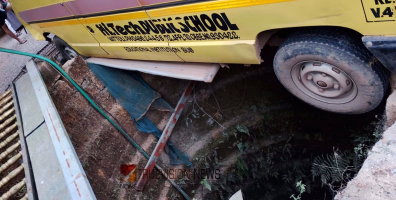 നാദാപുരത്ത് സ്കൂൾ ബസ് കിണറ്റിന് മുകളിലൂടെ ഇരച്ചുകയറി; വൻ അപകടം ഒഴുവായത് തലനാരിഴയ്ക്ക്